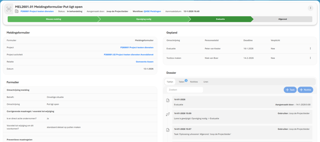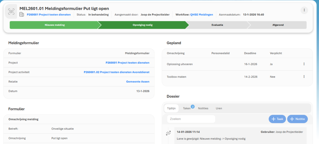 Deze tweede status heeft twee taken die zijn nu automatisch aangemaakt door het formulier naar deze tweede lane te verslepen. Ze staan rechtsboven in dit scherm. Zoals je ziet is er een verplichte taak bij. Dit betekent dat het formulier niet een status verder kan zolang deze verplichte taak niet is afgerond. Zet als QHSE manager de taken uit bij de medewerkers die ze moeten uitvoeren en wacht totdat deze zijn afgerond.
