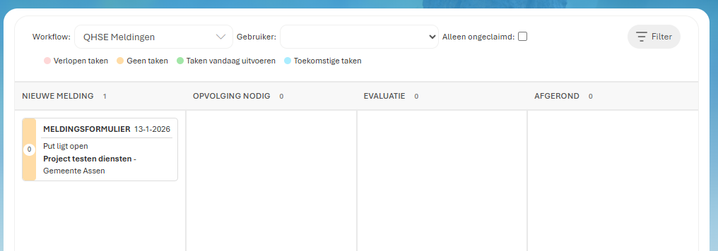 Nadat een medewerker een nieuw formulier heeft ingevuld staat deze in de workflow in de eerste lane. Ga naar QHSE/Workflows, kies de juiste workflow en kies ‘Alleen ongeclaimd’, je ziet dan alle ingevulde formulieren die geen verantwoordelijke QHSE medewerker gekoppeld hebben.
